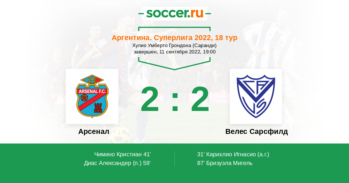 Аргентина. Суперлига 18.03.2018 Арсенал Логотип футбольный клуб Арсенал (Саранди) 1:1 Логотип футбольный клуб Велес Сарсфилд (Буэнос-Айрес) Велес Сарсфилд
