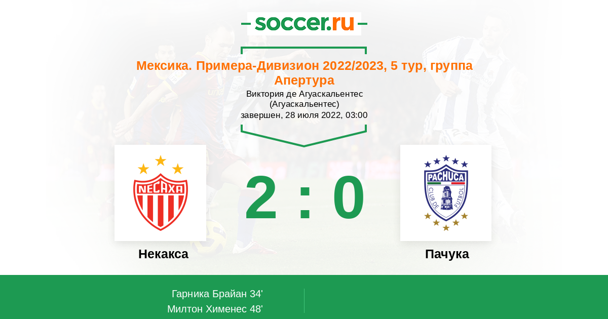 Мексика. Примера-Дивизион 31.07.2016 Пачука Логотип футбольный клуб Пачука 1:0 Логотип футбольный клуб Некакса (Агуаскальентес) Некакса