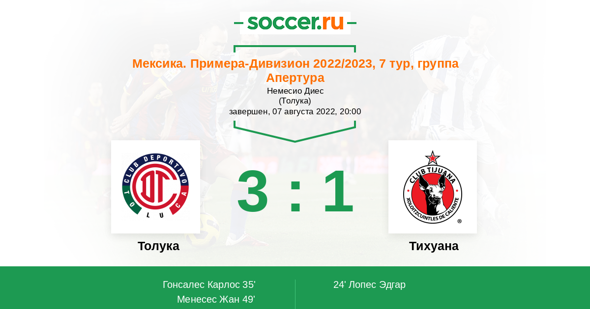 Мексика. Примера-Дивизион 07.08.2021 Тихуана Логотип футбольный клуб Тихуана 0:2 Логотип футбольный клуб Толука Толука