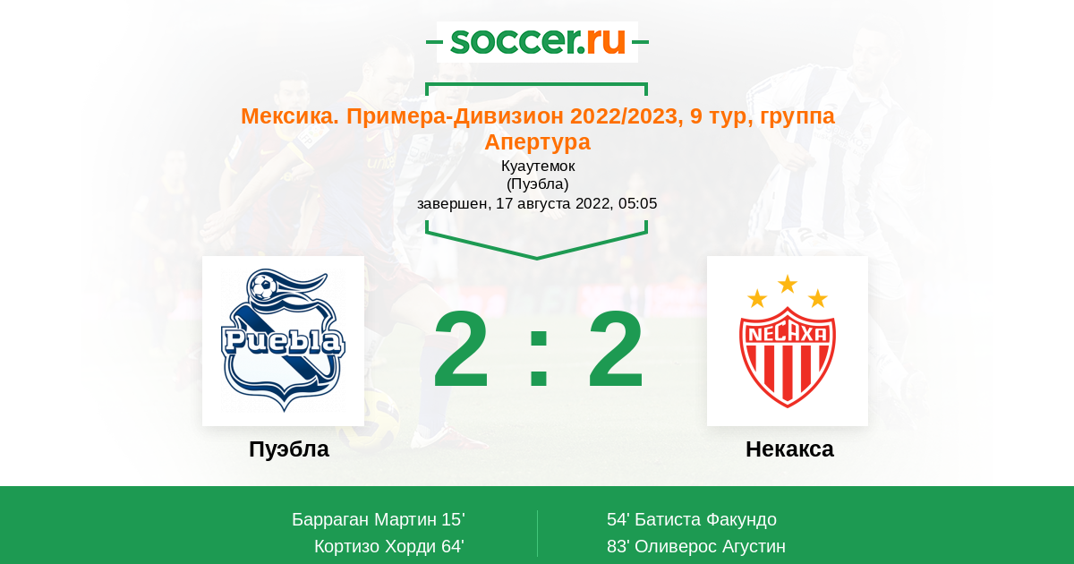 Мексика. Примера-Дивизион 19.08.2018 Некакса Логотип футбольный клуб Некакса (Агуаскальентес) 2:2 Логотип футбольный клуб Пуэбла (Пуэбла-де-Сарагоса) Пуэбла