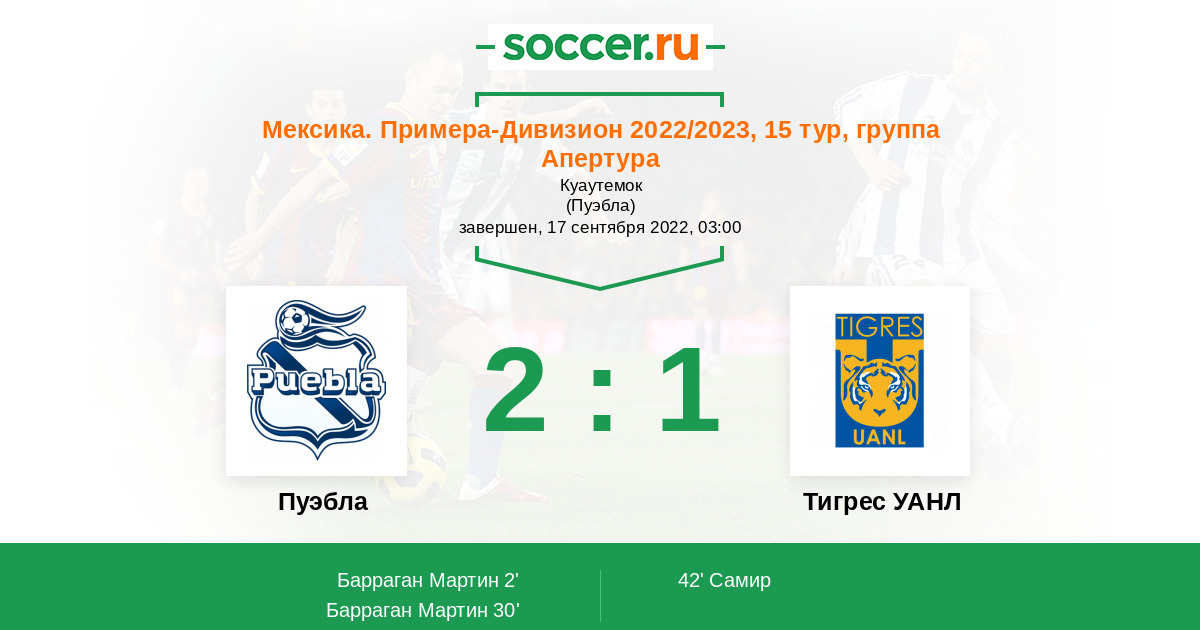 Мексика. Примера-Дивизион 05.03.2017 Пуэбла Логотип футбольный клуб Пуэбла (Пуэбла-де-Сарагоса) 0:2 Логотип футбольный клуб Тигрес УАНЛ (Монтеррей) Тигрес УАНЛ