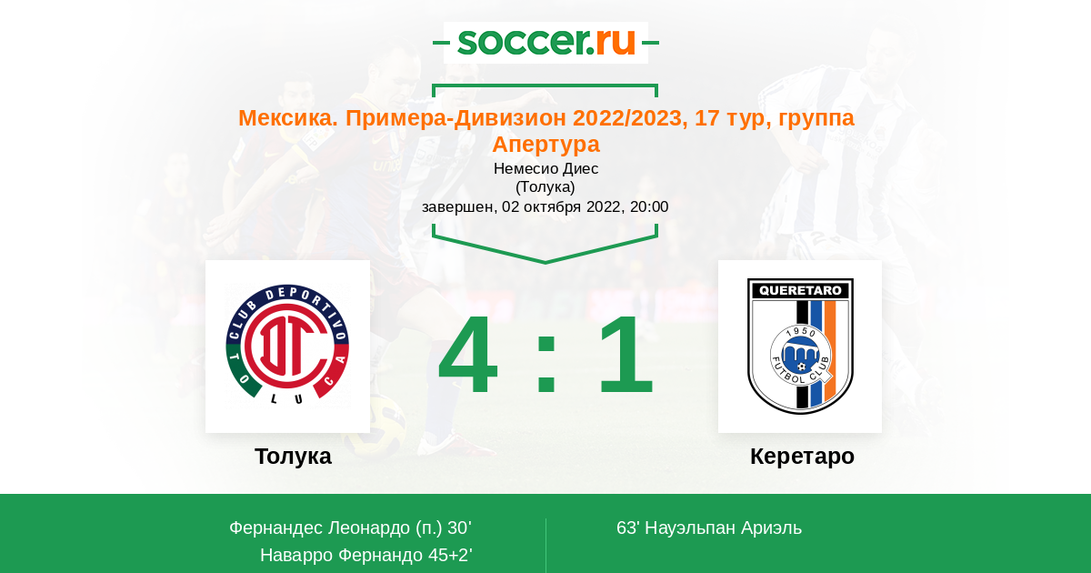Мексика. Примера-Дивизион 06.03.2023 Керетаро Логотип футбольный клуб Керетаро (Сантьяго-де-Керетаро) 1:0 Логотип футбольный клуб Толука Толука