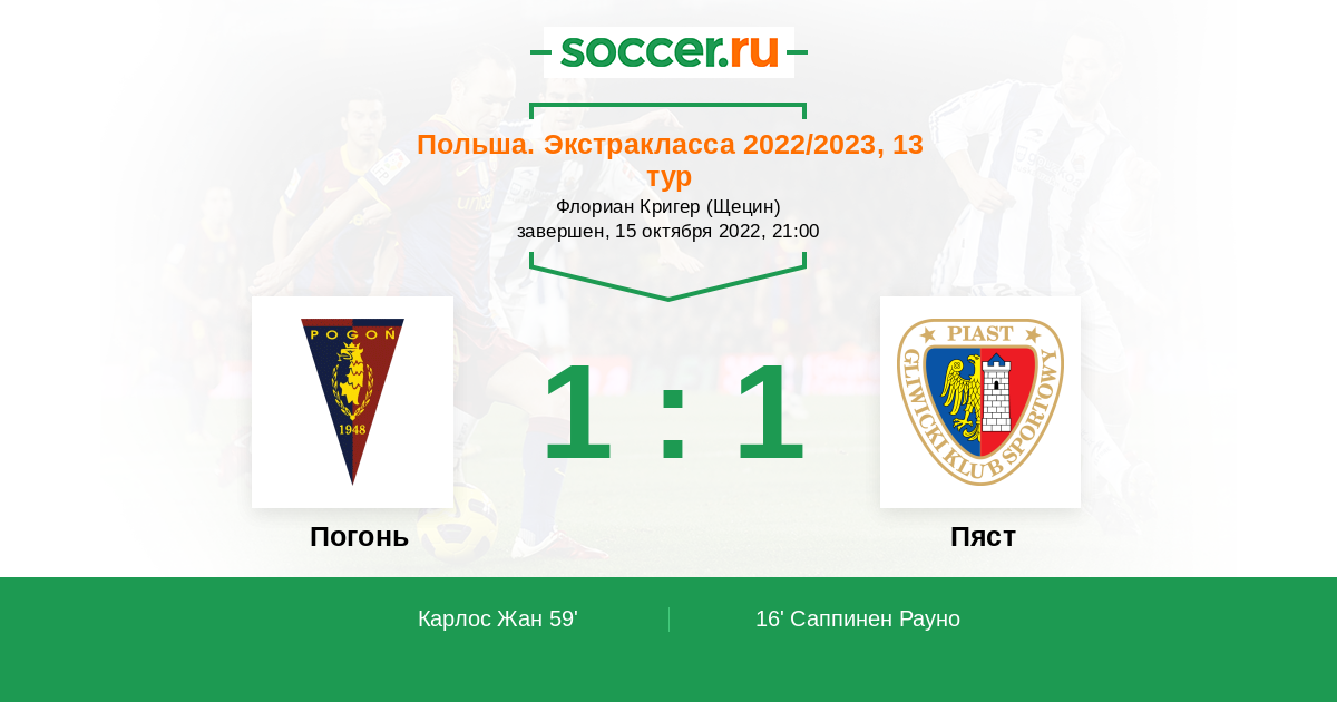Польша. Экстракласса 06.10.2024 Погонь Логотип футбольный клуб Погонь (Щецин) 1:0 Логотип футбольный клуб Пяст (Гливице) Пяст