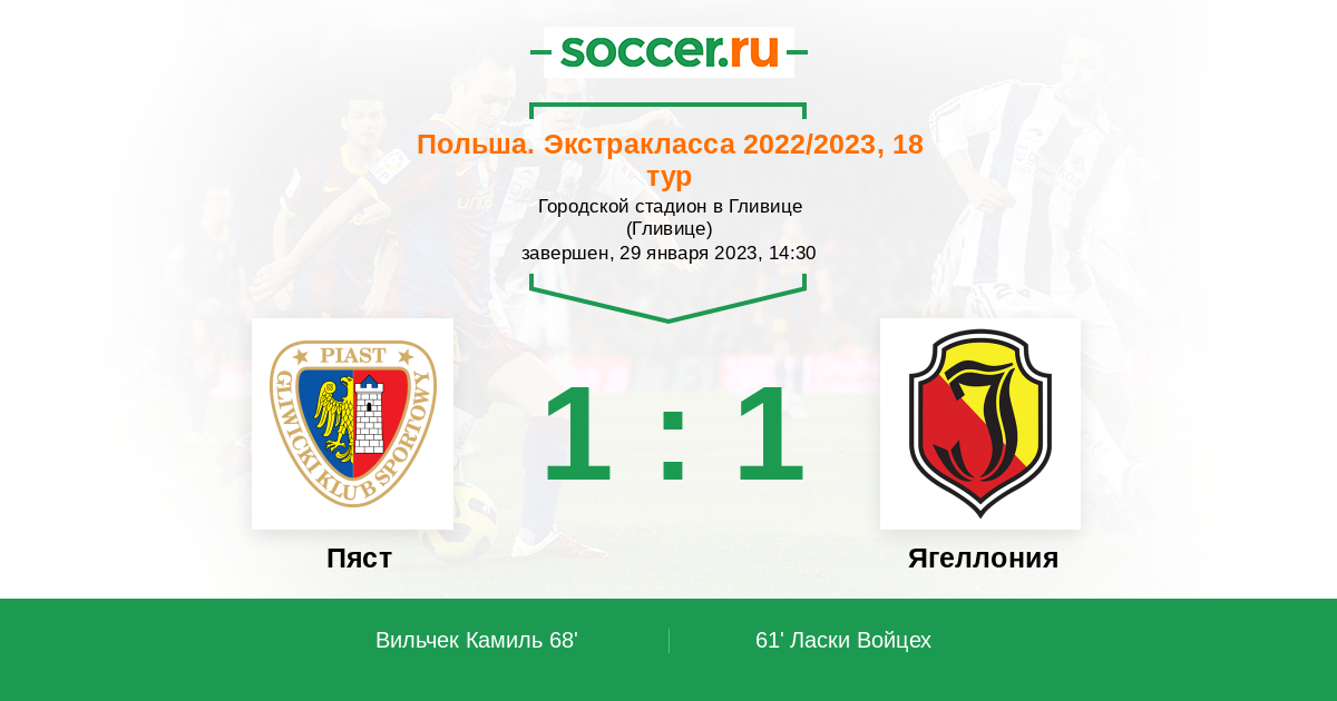 Польша. Экстракласса 30.10.2021 Ягеллония Логотип футбольный клуб Ягеллония (Белосток) 3:3 Логотип футбольный клуб Пяст (Гливице) Пяст