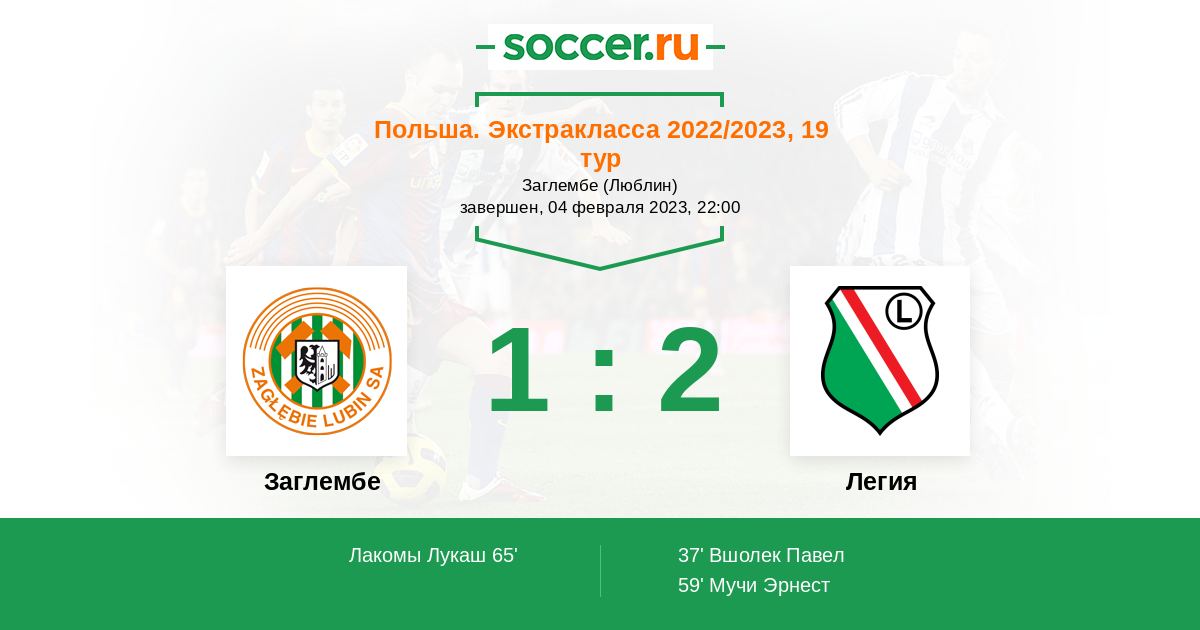 Польша. Экстракласса 23.07.2022 Легия Логотип футбольный клуб Легия (Варшава) 2:0 Логотип футбольный клуб Заглембе (Любина) Заглембе