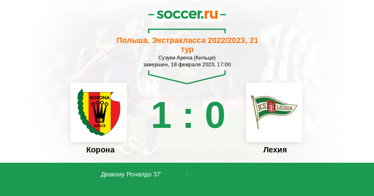 Польша. Экстракласса 31.03.2018 Корона Логотип футбольный клуб Корона (Кельце) 1:0 Логотип футбольный клуб Лехия (Гданьск) Лехия