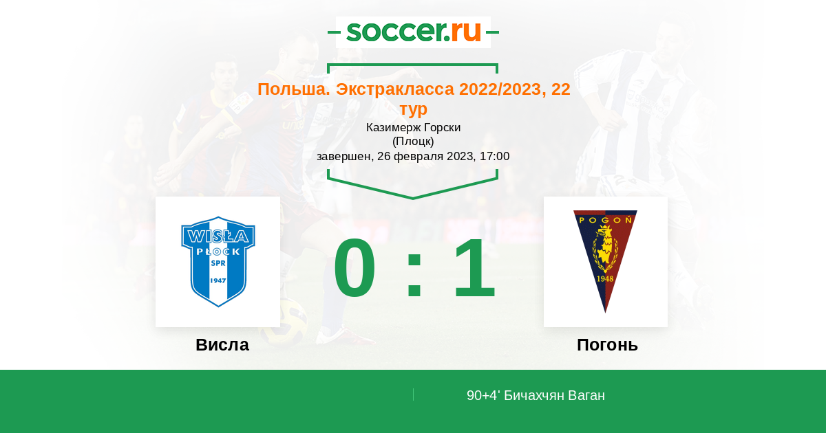 Польша. Экстракласса 08.04.2022 Погонь Логотип футбольный клуб Погонь (Щецин) 1:2 Логотип футбольный клуб Висла (Плоцк) Висла