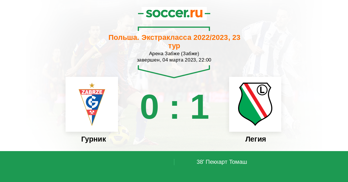 Польша. Экстракласса 24.09.2023 Легия Логотип футбольный клуб Легия (Варшава) 2:1 Логотип футбольный клуб Гурник (Забже) Гурник