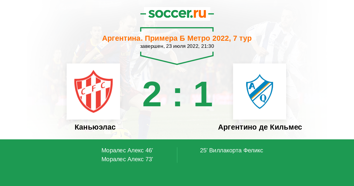 Аргентина. Примера Б Метро 08.07.2023 Аргентино де Кильмес Логотип футбольный клуб Аргентино де Кильмес 2:1 Логотип футбольный клуб Каньюэлас Каньюэлас