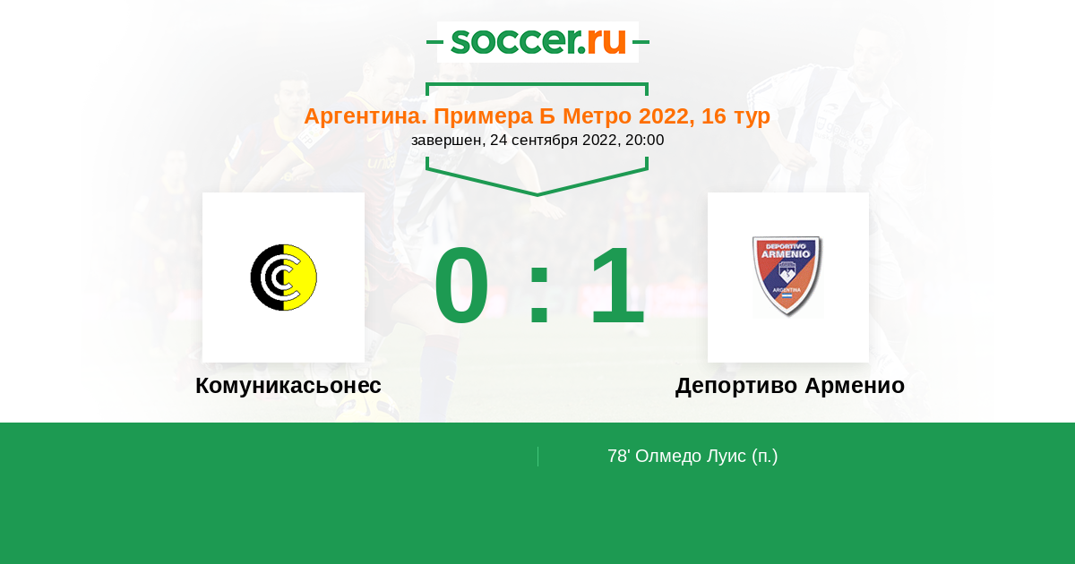 Аргентина. Примера Б Метро 22.09.2012 Комуникасьонес Логотип футбольный клуб Комуникасьонес (Буэнос-Айрес) 2:3 Логотип футбольный клуб Депортиво Арменио Депортиво Арменио
