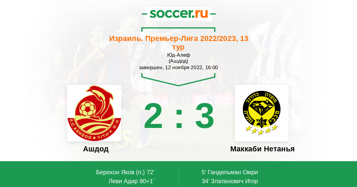 Израиль. Премьер-Лига 11.03.2023 Маккаби Нетанья Логотип футбольный клуб Маккаби Нетанья 0:2 Логотип футбольный клуб Ашдод Ашдод