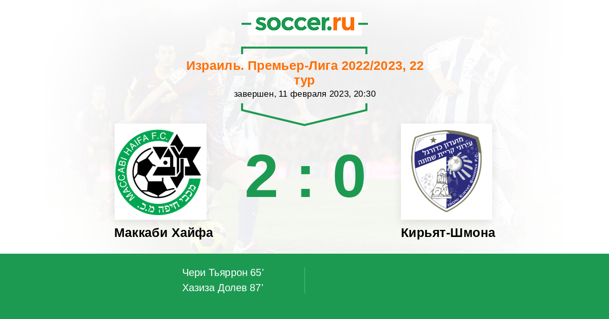 Израиль. Премьер-Лига 27.02.2021 Маккаби Хайфа Логотип футбольный клуб Маккаби Хайфа 4:2 Логотип футбольный клуб Кирьят-Шмона Кирьят-Шмона