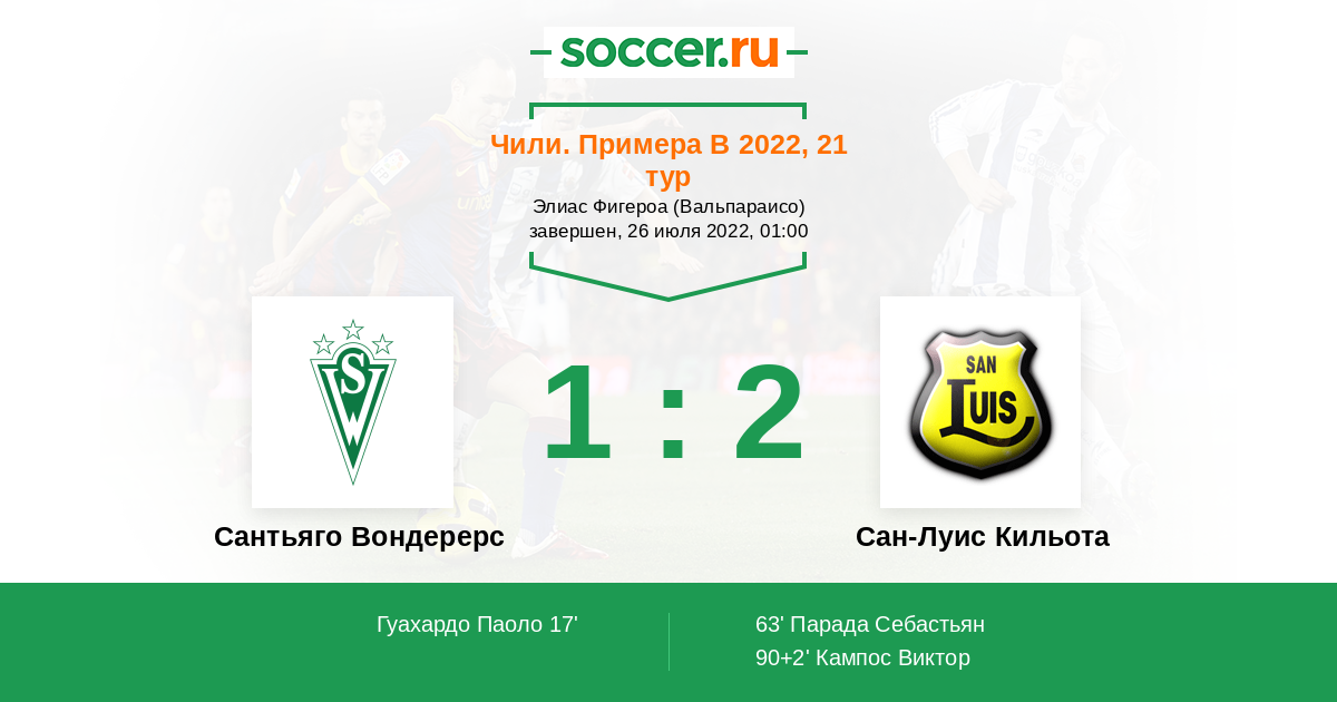 Чили. Примера дивизион 09.09.2017 Сан-Луис Кильота Логотип футбольный клуб Сан-Луис Кильота 0:2 Логотип футбольный клуб Сантьяго Вондерерс Сантьяго Вондерерс