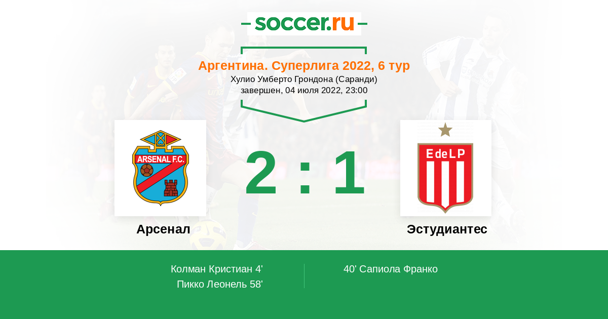 Аргентина. Суперлига 03.08.2021 Эстудиантес Логотип футбольный клуб Эстудиантес (Ла-Плата) 4:0 Логотип футбольный клуб Арсенал (Саранди) Арсенал