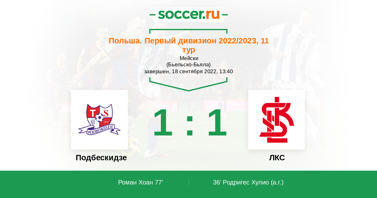 Польша. Первый дивизион 18.09.2021 ЛКС Логотип футбольный клуб ЛКС (Лодзь) 1:2 Логотип футбольный клуб Подбескидзе (Бельско-Бяла) Подбескидзе