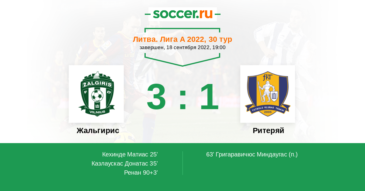 Литва. Лига А 20.03.2022 Жальгирис Логотип футбольный клуб Жальгирис (Вильнюс) 2:0 Логотип футбольный клуб Ритеряй (Тракай) Ритеряй