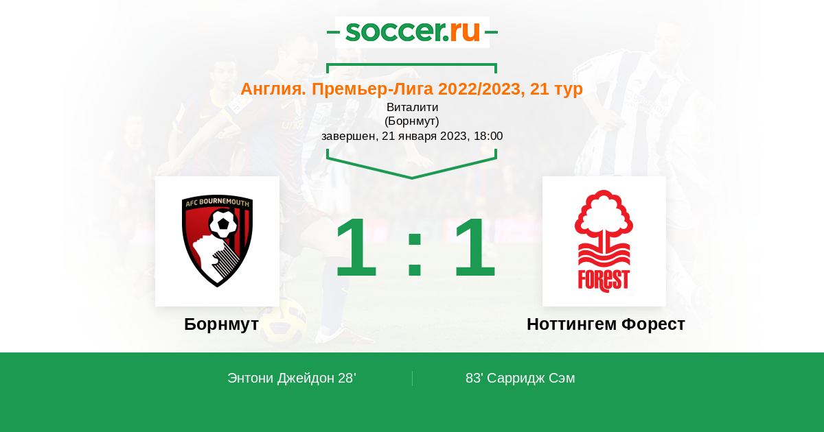 Англия. Премьер-Лига 04.02.2024 Борнмут Логотип футбольный клуб Борнмут 1:1 Логотип футбольный клуб Ноттингем Форест Ноттингем Форест