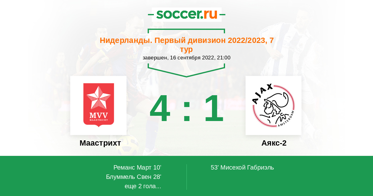 Нидерланды. Первый дивизион 20.02.2023 Аякс-2 Логотип футбольный клуб Аякс-2 (Амстердам) 4:2 Логотип футбольный клуб Маастрихт Маастрихт