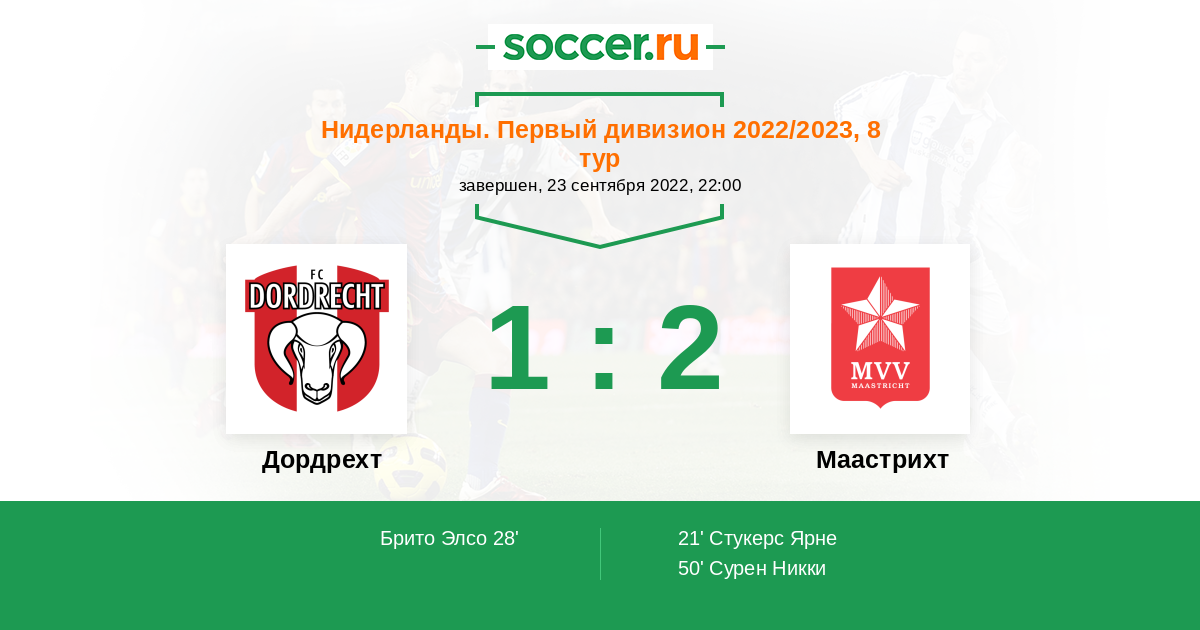 Нидерланды. Первый дивизион 14.04.2023 Маастрихт Логотип футбольный клуб Маастрихт 2:1 Логотип футбольный клуб Дордрехт Дордрехт