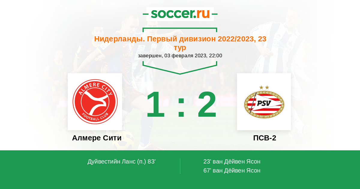 Нидерланды. Первый дивизион 10.01.2022 ПСВ-2 Логотип футбольный клуб ПСВ-2 (Эйндховен) 5:1 Логотип футбольный клуб Алмере Сити Алмере Сити
