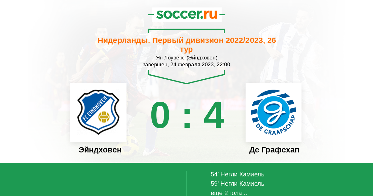 Нидерланды. Первый дивизион 11.12.2022 Де Графсхап Логотип футбольный клуб Де Графсхап (Дутинхем) 1:2 Логотип футбольный клуб Эйндховен Эйндховен