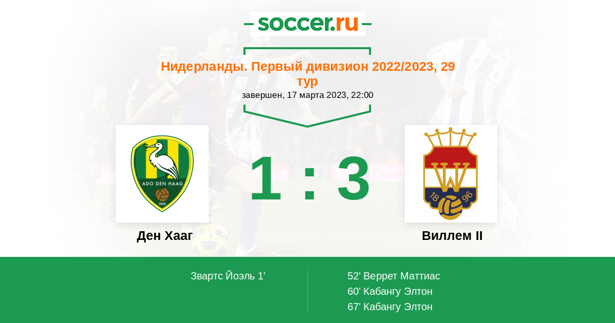 Нидерланды. Первый дивизион 02.09.2022 Виллем II Логотип футбольный клуб Виллем II (Тилбург) 1:0 Логотип футбольный клуб Ден Хааг (Гаага) Ден Хааг