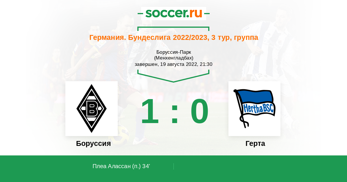 Германия. Бундеслига 23.10.2021 Герта Логотип футбольный клуб Герта (Берлин) 1:0 Логотип футбольный клуб Боруссия (Менхенгладбах) Боруссия