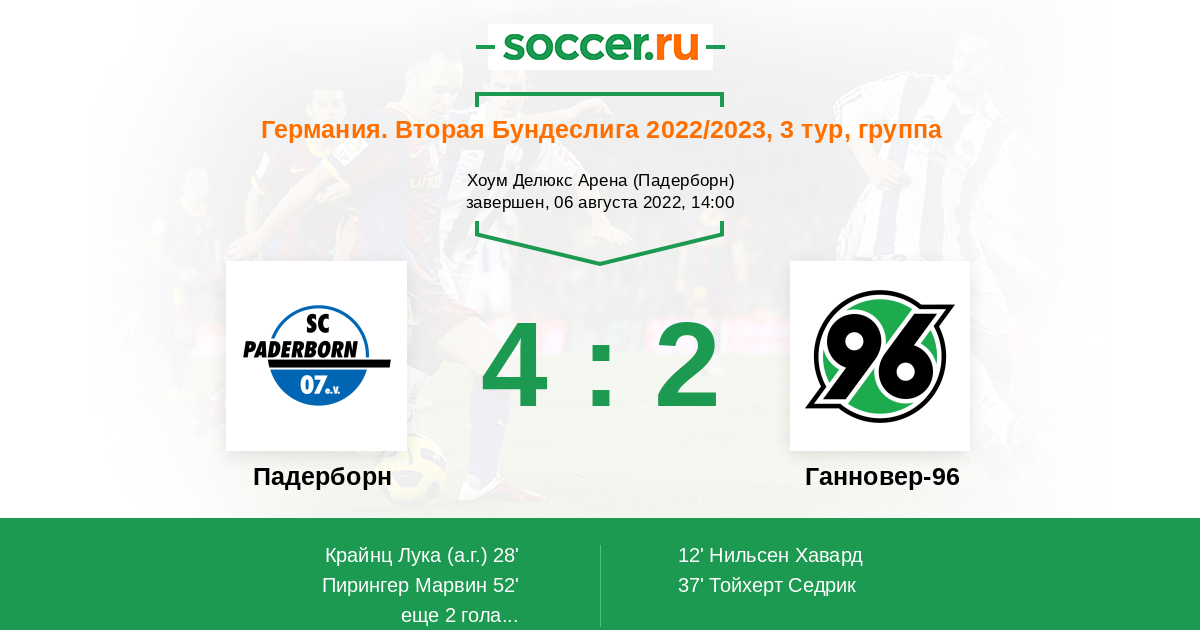 Я думаю что в этом противостоянии более чем явным фаворитом на победу является команда хозяев поля Падерборн . Команда хозяев поля разгромил Карлсруэ у себя в родных стенах со счётом 5:0 . А команда гостей Ганновер 96 проиграл на выезде Кайзерслаутерну . Думаю и в этом матче гостей ждёт проигрыш.