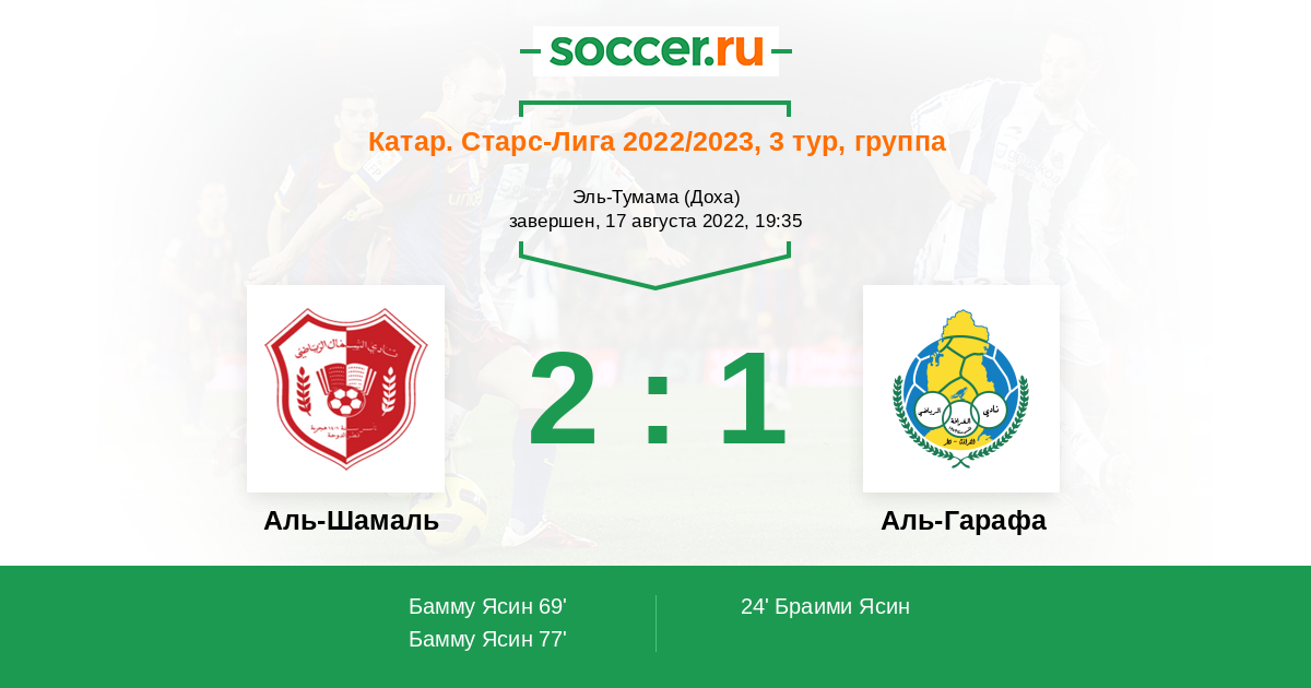Катар. Старс Лига 11.09.2021 Аль-Гарафа Логотип футбольный клуб Аль-Гарафа (Доха) 2:0 Логотип футбольный клуб Аль-Шамаль (Аш-Шамаль) Аль-Шамаль