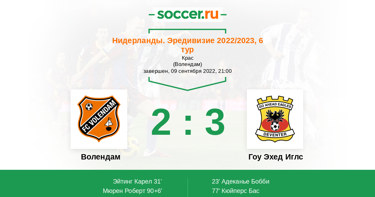 Нидерланды. Эредивизи 19.08.2023 Гоу Эхед Иглс Логотип футбольный клуб Гоу Эхед Иглс (Девентер) 4:1 Логотип футбольный клуб Волендам Волендам