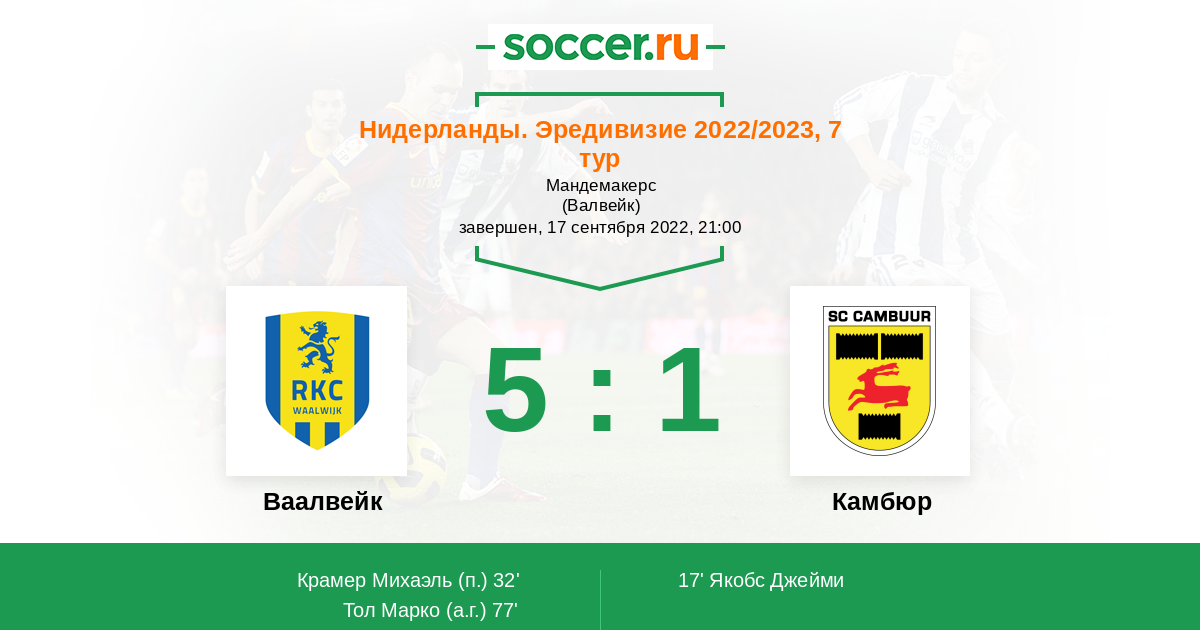 Нидерланды. Первый дивизион 29.09.2017 Камбюр Логотип футбольный клуб Камбюр (Лиуварден) 1:1 Логотип футбольный клуб Ваалвейк (Валвейк) Ваалвейк