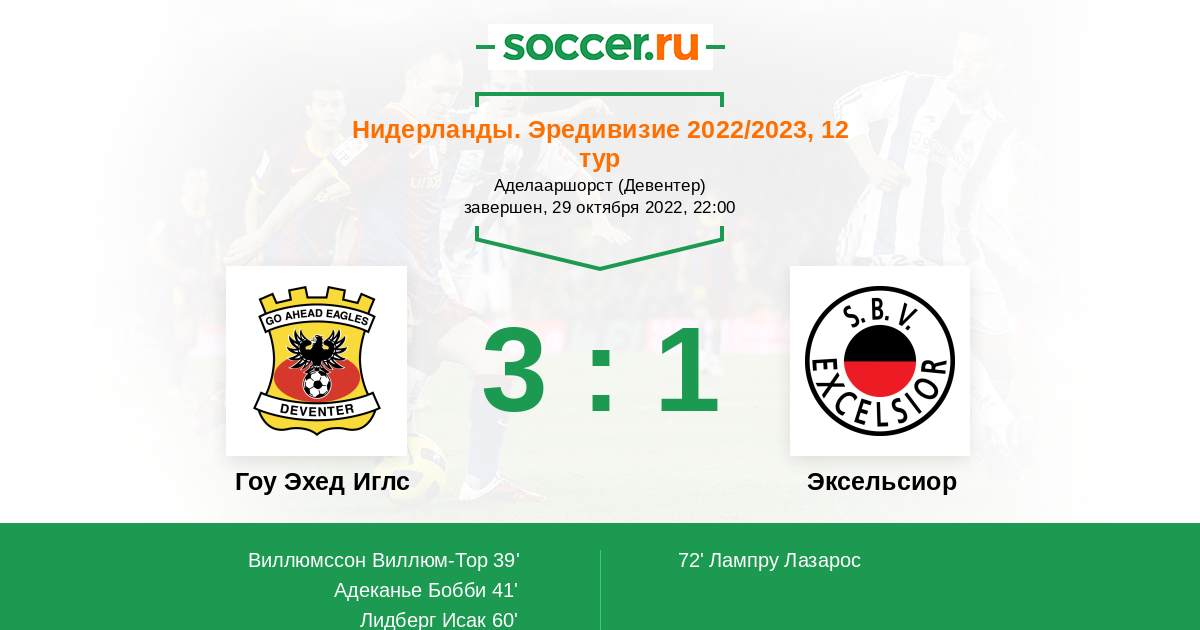 Нидерланды. Первый дивизион 02.11.2012 Эксельсиор Логотип футбольный клуб Эксельсиор (Роттердам) 1:6 Логотип футбольный клуб Гоу Эхед Иглс (Девентер) Гоу Эхед Иглс