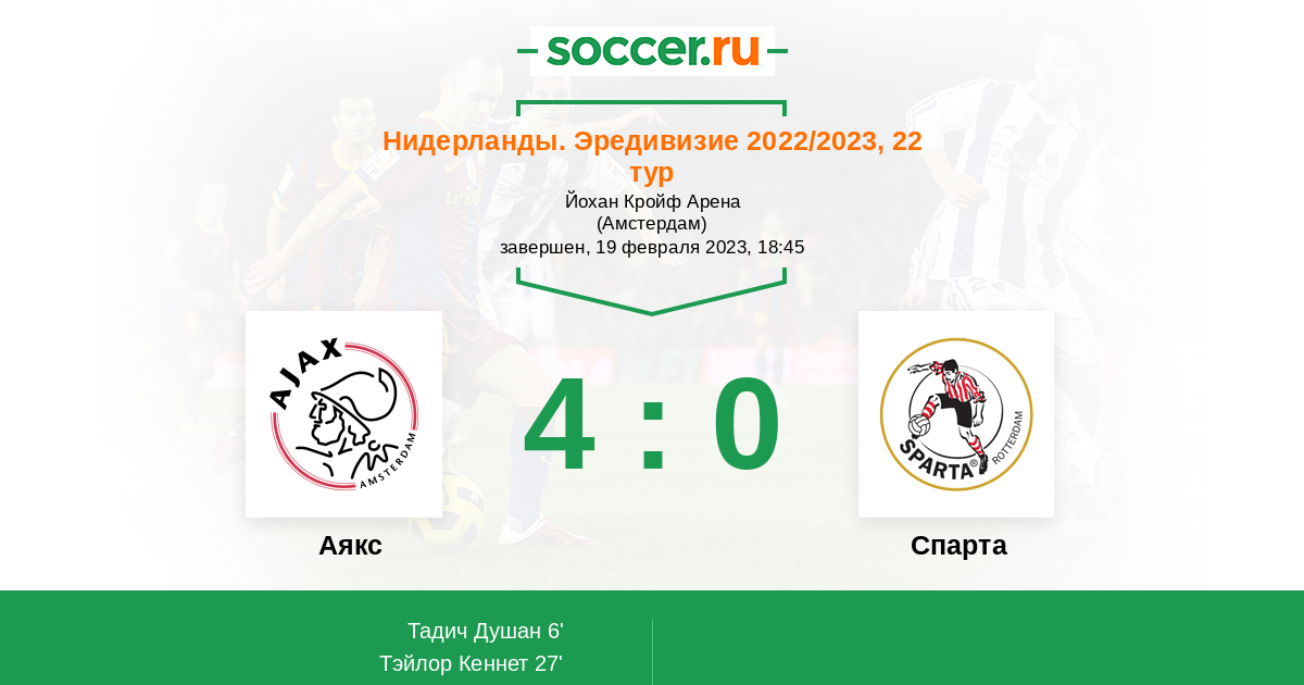 Нидерланды. Эредивизи 09.04.2022 Аякс Логотип футбольный клуб Аякс (Амстердам) 2:1 Логотип футбольный клуб Спарта (Роттердам) Спарта