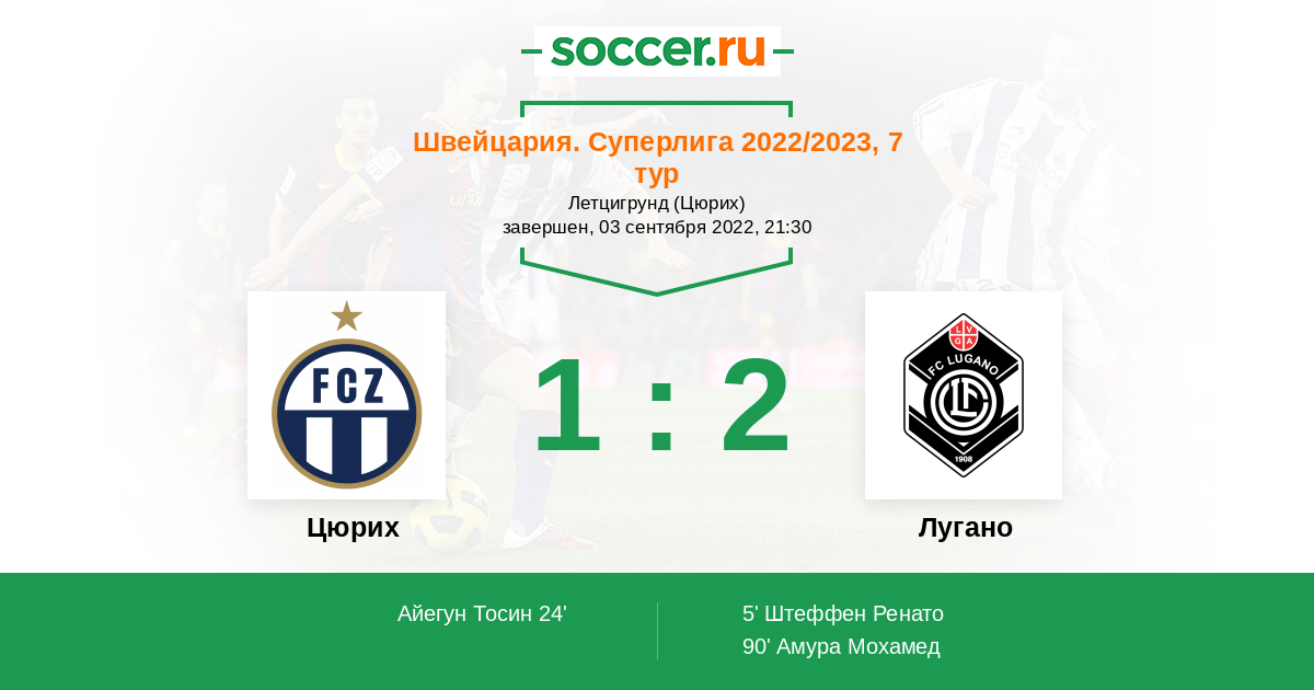 Швейцария. Суперлига 06.11.2022 Лугано Логотип футбольный клуб Лугано 2:0 Логотип футбольный клуб Цюрих Цюрих