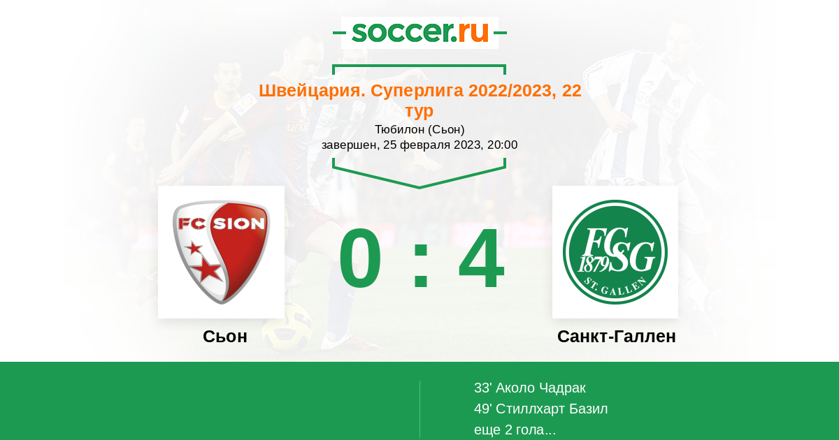 Швейцария. Суперлига 02.04.2022 Сьон Логотип футбольный клуб Сьон 0:3 Логотип футбольный клуб Санкт-Галлен Санкт-Галлен