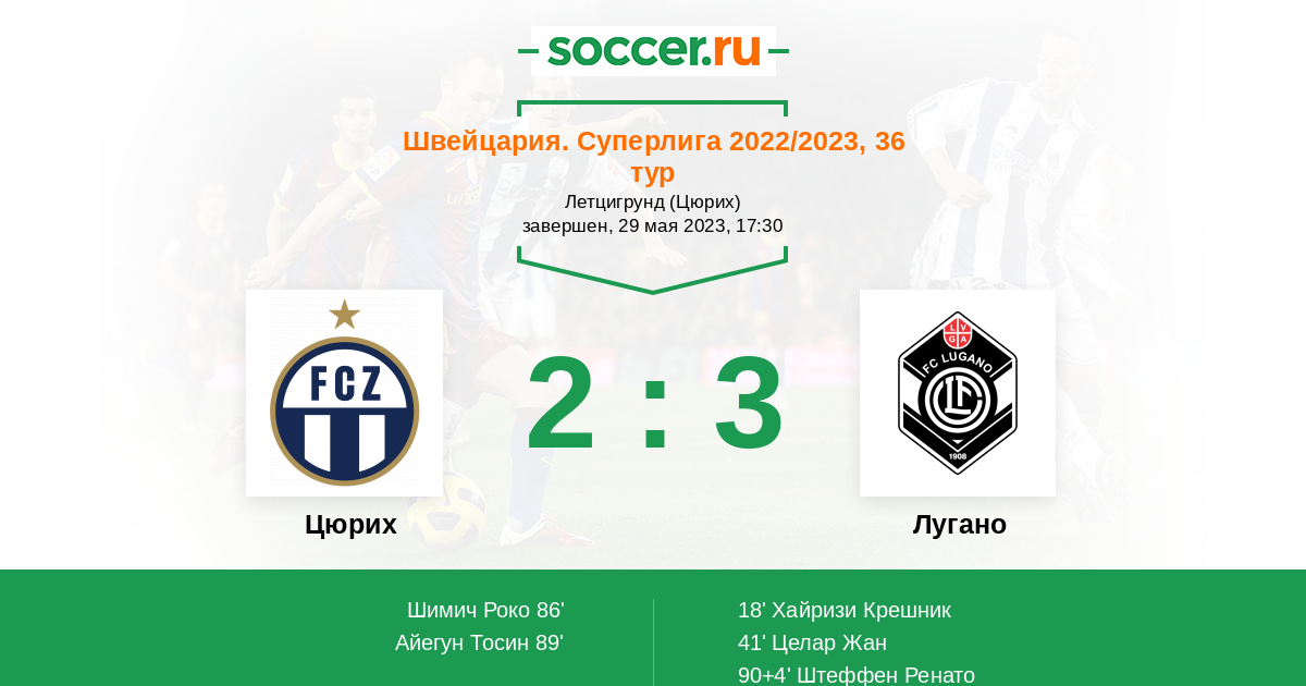 Швейцария. Суперлига 19.05.2022 Лугано Логотип футбольный клуб Лугано 2:1 Логотип футбольный клуб Цюрих Цюрих