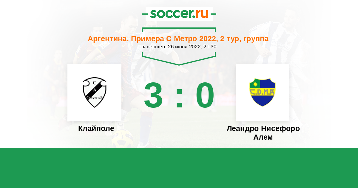 Аргентина. Примера С Метро 18.07.2021 Клайполе Логотип футбольный клуб Клайполе 0:0 Логотип футбольный клуб Леандро Нисефоро Алем (Буэнос-Айрес) Леандро Нисефоро Алем