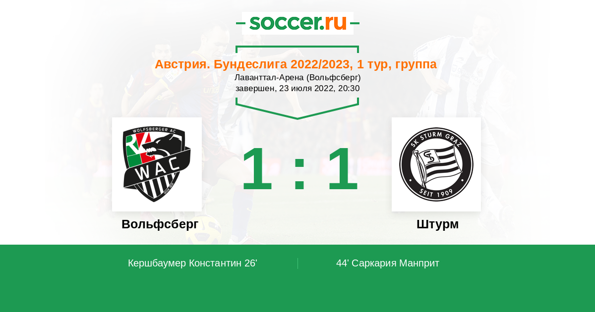 Австрия. Бундеслига 01.08.2021 Вольфсберг Логотип футбольный клуб Вольфсберг 1:4 Логотип футбольный клуб Штурм (Грац) Штурм