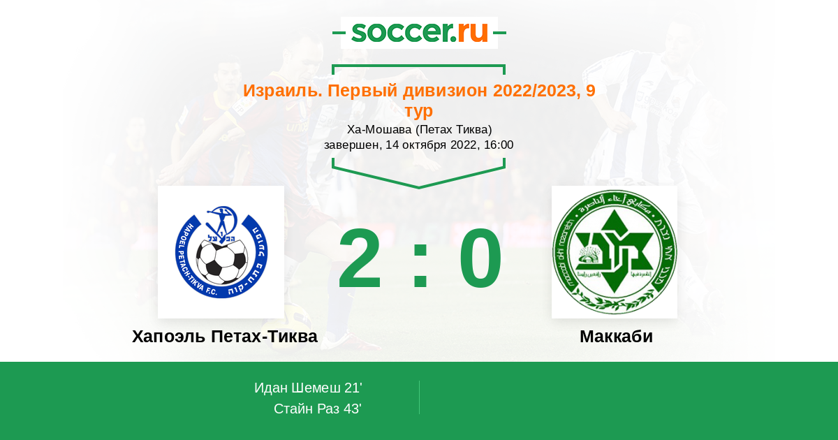 Израиль. Первый дивизион 22.09.2020 Хапоэль Петах-Тиква Логотип футбольный клуб Хапоэль Петах-Тиква 1:2 Логотип футбольный клуб Маккаби (Ахи Назарет) Маккаби