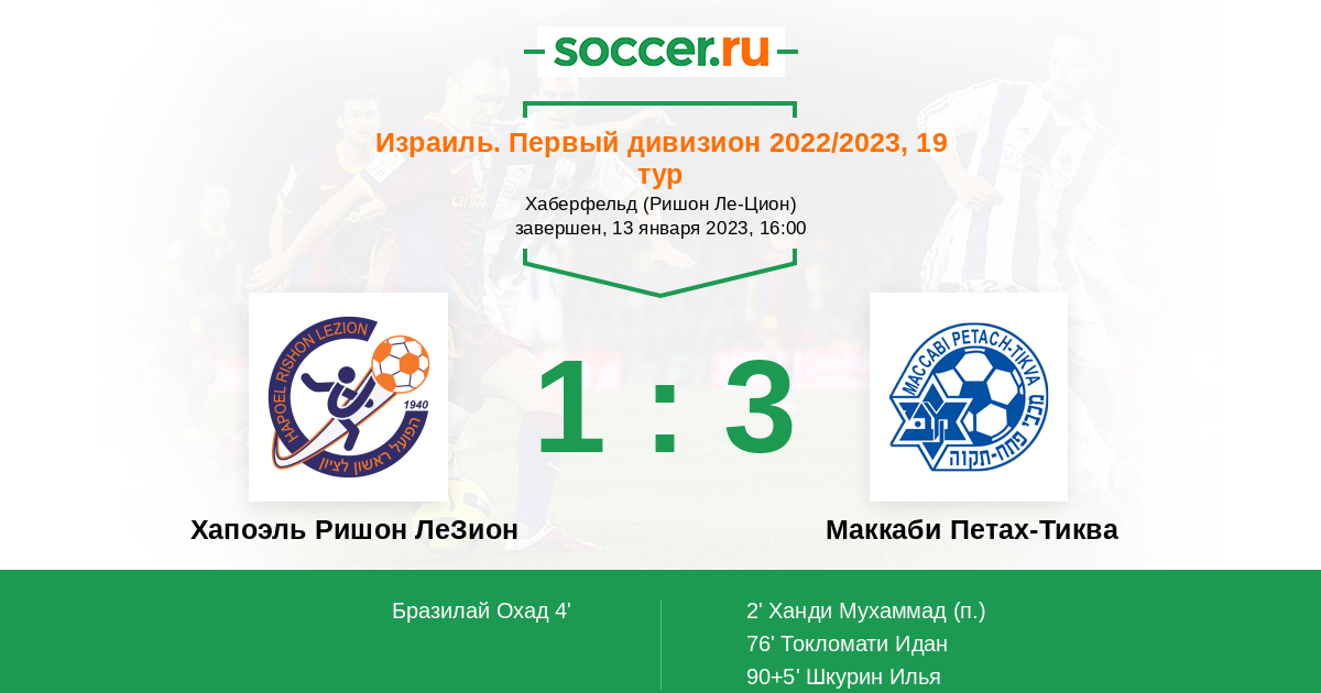 Израиль. Первый дивизион 29.03.2013 Хапоэль Ришон ЛеЗион Логотип футбольный клуб Хапоэль Ришон ЛеЗион 1:3 Логотип футбольный клуб Маккаби Петах-Тиква Маккаби Петах-Тиква