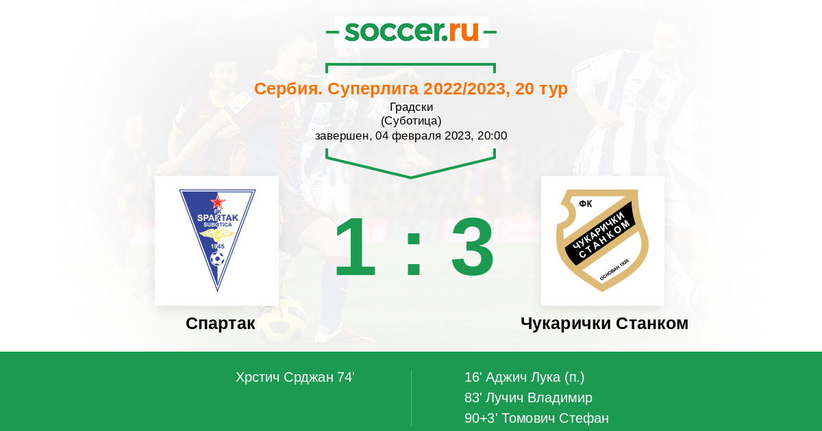 Сербия. Суперлига 06.03.2020 Чукарички Станком Логотип футбольный клуб Чукарички Станком (Белград) 4:1 Логотип футбольный клуб Спартак Суботица Спартак Суботица