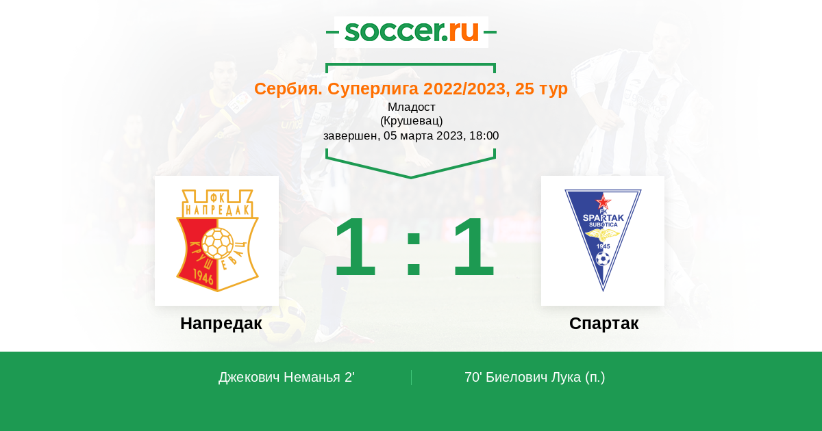 Сербия. Суперлига 22.04.2023 Напредак Логотип футбольный клуб Напредак (Крушевац) 1:0 Логотип футбольный клуб Спартак Суботица Спартак Суботица