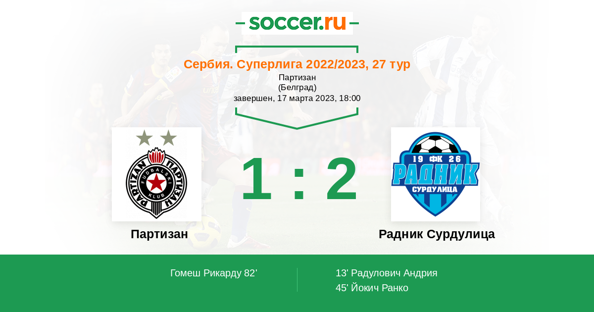 Сербия. Суперлига 08.04.2017 Партизан Логотип футбольный клуб Партизан (Белград) 2:1 Логотип футбольный клуб Радник Сурдулица Радник Сурдулица