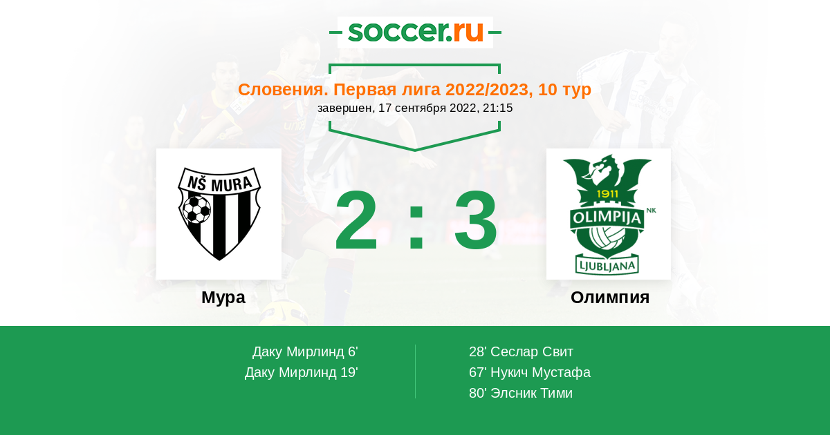 Словения. Первая Лига 17.07.2022 Олимпия Логотип футбольный клуб Олимпия (Любляна) 2:0 Логотип футбольный клуб Мура (Мурска Собота) Мура