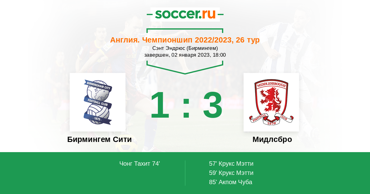 Англия. Чемпионшип 21.10.2023 Мидлсбро Логотип футбольный клуб Мидлсбро 1:0 Логотип футбольный клуб Бирмингем Сити Бирмингем Сити