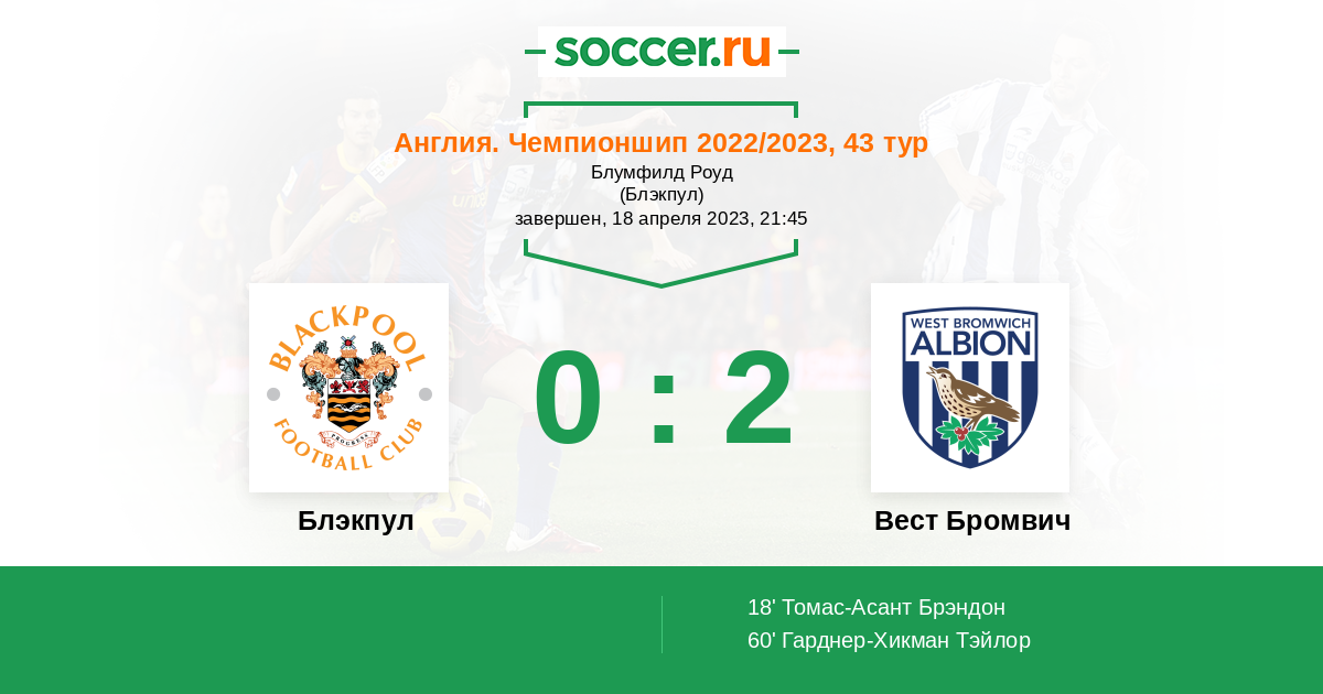 Англия. Чемпионшип 15.04.2022 Вест Бромвич Логотип футбольный клуб Вест Бромвич 2:1 Логотип футбольный клуб Блэкпул Блэкпул