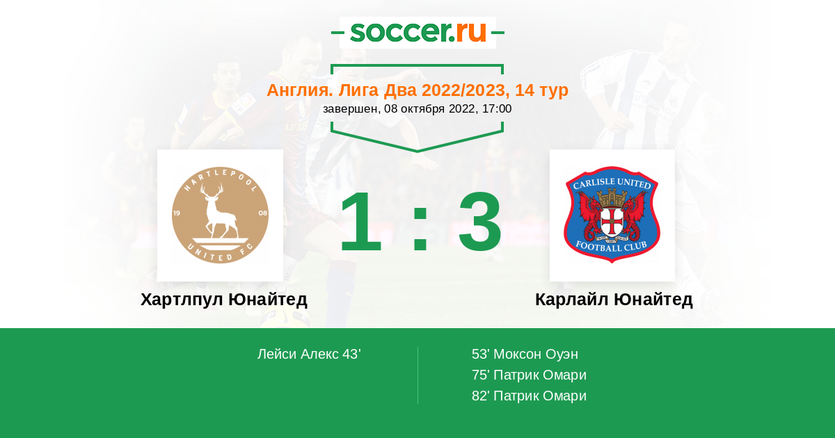 Англия. Вторая Футбольная Лига 04.10.2014 Хартлпул Юнайтед Логотип футбольный клуб Хартлпул Юнайтед 0:3 Логотип футбольный клуб Карлайл Юнайтед (Карлайсл) Карлайл Юнайтед