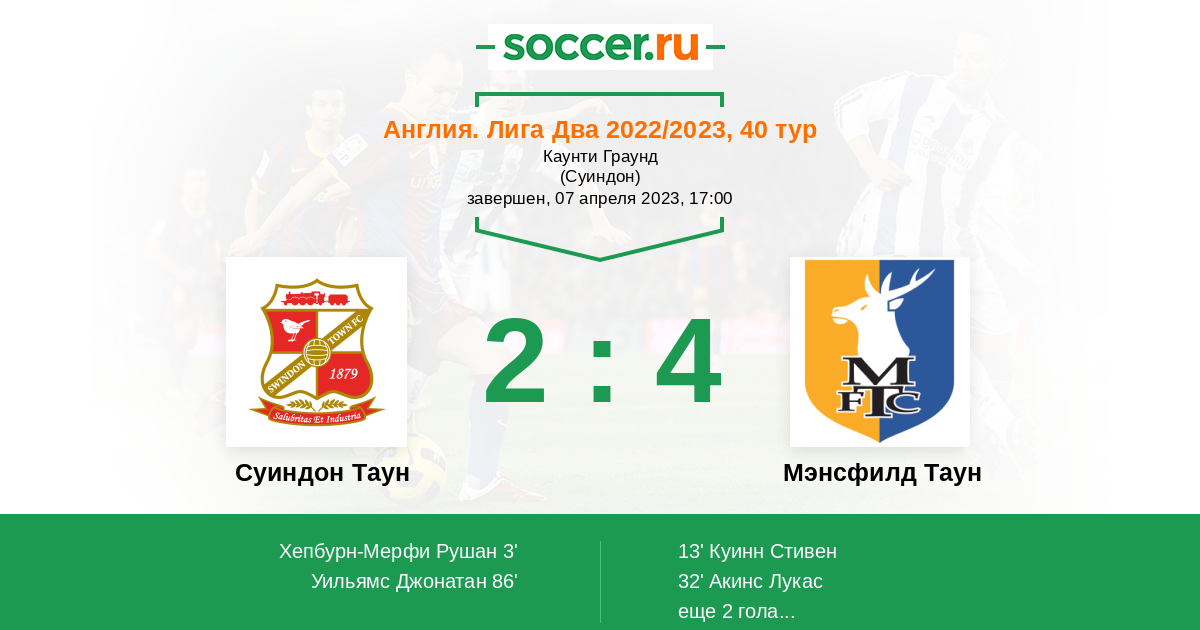 Англия. Вторая Футбольная Лига 25.11.2023 Суиндон Таун Логотип футбольный клуб Суиндон Таун 2:1 Логотип футбольный клуб Мэнсфилд Таун Мэнсфилд Таун