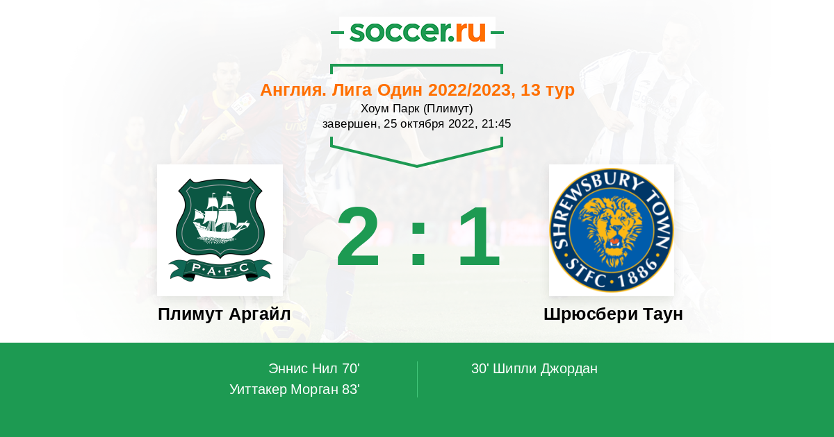 Англия. Первая Футбольная Лига 21.08.2021 Шрюсбери Таун Логотип футбольный клуб Шрюсбери Таун 0:3 Логотип футбольный клуб Плимут Аргайл Плимут Аргайл