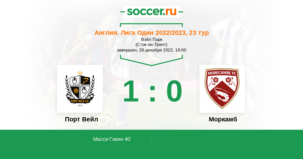 Англия. Первая Футбольная Лига 21.02.2023 Моркамб Логотип футбольный клуб Моркамб 1:0 Логотип футбольный клуб Порт Вейл (Сток-он-Трент) Порт Вейл
